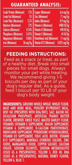 Ingredients: Ground Whole Wheat, Wheat Flour, Meat and Bone Meal, Poultry By-product Meal, Beef Fat (Preserved with Bha/bht), Salt, Bacon Fat, Dicalcium Phosphate, Artificial Peanut Butter Flavor, Brewers Dried Yeast, Malted Barley Flour, Vitamins (Vitamin E Supplement, Niacin Supplement, Vitamin A Supplement, D-calcium Pantothenate, Riboflavin Supplement, Pyridoxine Hydrochloride, Vitamin D3 Supplement, Folic Acid, Biotin, Vitamin B12 Supplement), Minerals (Ferrous Sulfate, Zinc Oxide, Manganous Oxide, Copper Sulfate, Calcium Iodate, Sodium Selenite), Sodium Metabisulfite (Used As A Preservative), Yellow 5, Red 40, Bha (Used As A Preservative), Natural Honey Flavor, Yellow 6, Blue 1