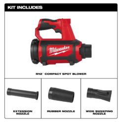 - Includes: M12 Compact Spot Blower, extension nozzle, wide sweeping nozzle & rubber nozzle