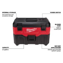 - Includes: 0880-20 M18 18-Volt 2 Gal. lithium-ion cordless wet/dry vacuum (tool-only) and 48-11-1837 M18 18-Volt lithium-ion HIGH OUTPUT CP 3.0Ah battery pack (2-pack)