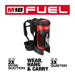 The Milwaukee M18 FUEL 3-in-1 Backpack Vacuum brings unmatched performance, portability and versatility to jobsite cleanup. The POWERSTATE brushless motor and cyclonic vacuum technology deliver up to 2X more suction. The portable backpack vacuum cleans up drywall dust, concrete dust, wood/metal shavings and other common jobsite debris quicker and more efficiently. An integrated quick release removable harness with an integrated canister hook allows the user to wear, hang and carry the canister vacuum for ultimate cordless cleaning versatility. At only 76 dB(A), the cordless vacuum is up to 3X quieter than a traditional jobsite shop vac, allowing for quiet operation in occupied spaces. The included HEPA filter ensures optimal dust and microparticle collection. As a part of the M18 system of tools, it is powered by REDLITHIUM battery packs, which deliver up to 25-minutes of run time on a HIGH DEMAND 9.0 Battery Pack in high mode and over 40 plus minutes of run time in low mode. For added convenience, the bagless backpack vacuum cleaner empties debris at the click of a button, reducing downtime when the canister is full and allowing you to get back to the task at hand. Whether it is used for spot, area or final cleanups, the M18 FUEL 3-in-1 Backpack Vacuum can go anywhere on any jobsite to complete countless cleanup tasks. Includes A M18 XC Extended Capacity Battery Pack 5.0 Ah (48-11-1850).