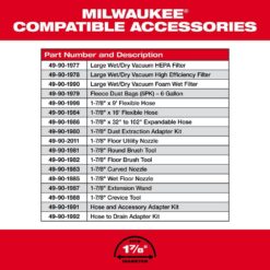 The Milwaukee M18 FUEL 6 Gallon Wet/Dry Vacuum brings unmatched performance, durability and versatility to jobsite cleanup. The POWERSTATE Brushless Motor and optimized components Outperform 3.5 Peak HP Wet/Dry Vacuums, delivering more cleaning power than corded. The wet/dry vac cleans up more common jobsite debris like drywall dust, concrete dust and wood/metal shavings than 3.5 peak HP wet/dry vacuums in the same amount of time. The Milwaukee AIR-TIP3-Piece Automotive Vacuum Tool Kit is an ideal mix for interior car detail cleaning. This automotive vacuum kit features 3 AIR-TIP Trade Focused Vacuum Accessories, including the AIR-TIP Swiveling Palm Brush, AIR-TIP3-in-1 Crevice and Brush Tool, AIR-TIP Flexible Long Reach Crevice Tool and a Vacuum Tool Storage Bag. Kit Includes: 0910-20 M18 FUEL 6 Gal. Cordless Wet/Dry Shop Vacuum with Filter, Hose and Accessories and 49-90-2019A AIR-TIP 1-1/4 in. – 2-1/2 in. Automotive Kit With Crevice Tools, Utility Nozzle and Bag for Wet/Dry Shop Vacuums (4-Piece).