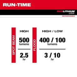 - 3-light output modes: spot high mode: 500 Lumens 3.5-hours, flood high mode: 400 Lumens 3.5-hours, flood low mode: 100 Lumens 12-hours