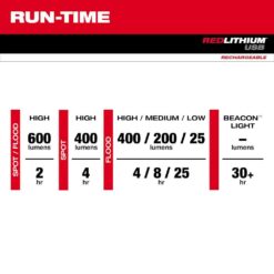 - 125M spot beam distance 5 light output modes: hybrid spot/flood: 600 Lumens- 2.5-hours, flood High: 400 Lumens- 4.5-hours, flood medium: 200 Lumens- 8.5-hours, flood low: 25 Lumens- 22-hours, spot high: 400 Lumens- 4.5-hours, BEACON light: 30 plus hours