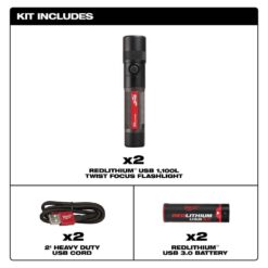 - Includes: two 2161-20 USB rechargeable 1100 l twist focus flashlight, 2 redlithium USB 3.0 battery, 2 micro-USB 3 ft. cable