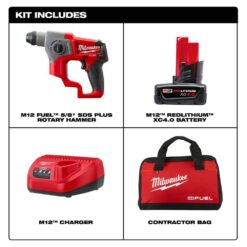 The Milwaukee M12 FUEL 5/8 in. SDS Plus Rotary Hammer Kit provides up to 75% faster drilling, up to 70% less vibration and up to 2X more runtime and the largest SDS Plus bit capacity in its class. Milwaukee has combined its exclusive POWERSTATE Brushless Motor, REDLITHIUM Battery Pack and REDLINK PLUS Intelligence to deliver users optimized performance, overload protection and superior pack construction. The electro-pneumatic design allows for drilling of up to 5/8 in. holes in concrete and masonry. At only 10 in. L and 3.9 lbs., this tool provides performance and runtime that is comparable to a much larger tool, at a fraction of the size and weight. The rotary hammer also features 2-mode operation, rotary hammer and rotation only for maximum versatility, regardless of application or orientation. In addition to the rotary hammer, this kit includes one M12 REDLITHIUM XC 4.0 Extended-Capacity Battery Packs, one M12 Charger and a plastic carrying case.