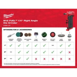 - Includes: 2485-20 M12 FUEL Right Angle Die Grinder, wrench 2, (1) 48-11-2425 M12 REDLITHIUM HIGH OUTPUT CP2.5 Battery Pack