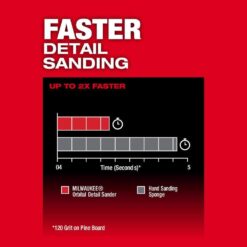 Designed for the professional carpenter, remodeler, or general contractor; the M12 FUEL Orbital Detail Sander is optimized for precision and designed to complement larger sanders on the jobsite. The M12 FUEL Orbital Detail Sander delivers faster detail sanding, stain grade finish, and more access in corners and contours. The POWERSTATE Brushless Motor and REDLINK PLUS intelligence provides the power to remove material Up to 2X Faster than traditional hand sanding solutions on the market and protects from overload, overheating, and over discharge. The detail sander features an orbital eccentric motion with a 1.5mm orbit diameter to deliver a clean, consistent stain-grade surface finish. The new-to-world pad shape provides sharp, straight edges for greater accuracy and access into confined corners. The sponge pad allows the abrasive to contour to the work surface when working with complex trim profiles, while the pad saver protects against excessive heat buildup to extend the life of the backing pad. The lightweight and ergonomic tool design at 1.3lbs provides unmatched maneuverability when used across multiple orientations. The innovative counterweight mechanism minimizes vibration to reduce user fatigue and maximizes comfort when used at long durations. The sander features a variable speed trigger with a lock-on button and four speed settings that offer adjustment from 14K – 4K for increased control across a wide variety of materials.