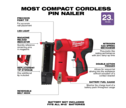 The MILWAUKEE 2540-20 M12 23-Gauge Pin Nailer is the most compact cordless pin nailer