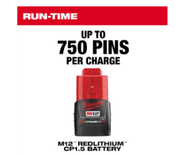 Features all-day run time with up to 750 pin nails per charge when paired with an M12 REDLITHIUM CP1.5 battery pack.