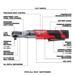 The MILWAUKEE M12 FUEL 1/2 in. Ratchet is the first cordless tool that provides both the torque and compact size to replace pneumatic ratchets in the industry. This cordless ratchet kit includes 2 REDLITHIUM batteries, an M12 battery charger and carrying case. This Milwaukee ratchet delivers up to 60ft-lbs of max torque and 175rpm’s making it the ideal fastening solution for automotive mechanics, repair technicians and maintenance workers who demand maximum performance and convenient portability. The M12 battery powered ratchet has a low profile head and cordless design which allows users more access in tight spaces than competitive units. With the industry leading FUEL technology, a reinforced mechanism and investment cast steel yoke housing, this rechargeable ratchet can withstand daily jobsite wear and tear for years of reliable use. Milwaukee’s cordless ratchet has eliminated the constant maintenance of pneumatic ratchets and the nuisance of an air hose in the shop. The M12 FUEL Ratchet delivers the maximum portability and productivity for the professional user.