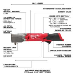 The Milwaukee M12 FUEL 3/8 in. and 1/2 in. Right Angle Impact Wrench with Friction Ring set is the industry’s most powerful right angle impact wrench. This battery-powered right angle impact wrench delivers up to 220 ft. lbs. of nut-busting torque without kickback. This durable cordless impact wrench easily fits into tighter spaces than traditional pistol-grip impact wrenches with a profile head of only 2.2 in., reducing the user’s need for socket extensions. The 4-Mode Drive Control provides users with unmatched control in various fastening and bolt removal applications. Modes 1-3 provide RPM and IPM adjustments for precision control. Mode 4 has Auto Shut-off in forward and Bolt Removal Mode in reverse. The Auto Shut-off Mode prevents over-tightening of bolts by applying no more than 15 ft.-lbs. of torque. Bolt Removal Mode drastically slows down the RPMs once the bolt is loosened for more control. Milwaukee REDLINK PLUS Intelligence ensures users achieve maximum performance and protection against overloads, over-heating, and over-discharge. The M12 REDLITHIUM Battery Packs (not included) are compatible with all M12 tools, delivering more work per charge and more work over the life of the pack.