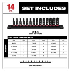- 49-66-7003 includes: 14 deep metric sockets, the following sizes are included: 4, 4.5, 5, 6, 7, 8, 9, 10, 11, 12, 13, 14, 15