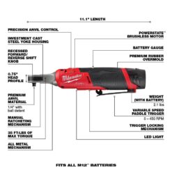 - Includes (1) M12 FUEL 1/4 in. high speed ratchet (2566-20), (2) M12 REDLITHIUM CP2.0Ah battery (48-11-2420), (1) M12 charger (48-59-2401), and (1) soft carrying case