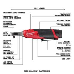 - Includes 1 M12 FUEL 3/8 in. high speed ratchet (2567-20), two M12 REDLITHIUM CP2.0Ah battery (48-11-2420), one M12 charger (48-59-2401), one soft carrying case and one 3/8 in. drive SAE and metric impact socket set (43-piece)