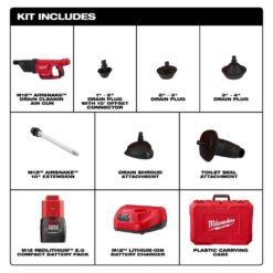 - Includes: (1) M12 AIRSNAKE drain cleaning air gun, (2) M12 REDLITHIUM CP 2.0 battery, (1) M12 Lithium-ion battery charger, (1) 1 in. – 2 in. drain plug, (1) 2 in. – 3 in. drain plug, (1) 3 in. – 4 in. drain plug, (1) drain shroud attachment, (3) straight connectors, (1) 15° offset connector, (1) toilet seal attachment, (1) 10 in. extension and (1) carrying case