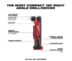 With a total profile length of just 3-3/4 in. the Milwaukee 2615-20 M18 Cordless lithium-ion Right Angle Drill is a compact, powerful solution for drilling and driving in tight spaces.