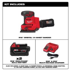 - Includes: M18 sheet sander, dust bag, universal Vac adapter, 2 sheets of sandpaper, M18 5.0 Ah Battery and M12/M18 charger