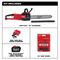 - Includes: 1 M18 FUEL 16 in. chainsaw, 1 REDLITHIUM high output HD12.0 battery pack, 1 M18 and M12 rapid charger, two 16 in. oregon bar and chain, 1 scrunch