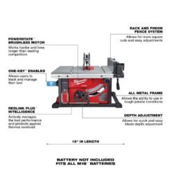The Milwaukee Cordless M18 FUEL 8-1/4 in. Table Saw with ONE-KEY delivers the power of a 15 Amp corded saw with 24-1/2 in. of Rip Capacity and up to 600 lin. ft. of cutting per charge. Designed for the professional carpenter, remodeler and general contractor, the cordless battery powered table saw is optimized for power, portability and productivity. Integrated ONE-KEY Smart Technology enables wireless tool connectivity to smart devices including smart phones and tablets. It easily track and manage a tool’s performance and location. The technology is built into the tool, not the battery, for tracking even on an empty charge. Integrated Tool Tracking provides full visibility to how and where tools are being used across your network of jobs and users within a 100 ft. range of your smart device. Integrated Tool Security protects your investments with features like remote tool lock-out or the ability to hide your tools from other smart devices. The POWERSTATE Brushless Motor was purposely built for the M18 FUEL 8-1/4 in. Table Saw with ONE-KEY to provide the power and performance of a 15 Amp corded circular saw.