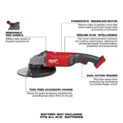 The M18 FUEL 7 in./9 in. Large Angle Grinder is the world’s first 18v LAG generating the power of a 15 Amp corded large angle grinder, is up to 2 lbs. lighter and has 9 in. grinding capacity. Providing high performance, advanced ergonomics and legendary durability, this grinder is designed to complete the toughest grinding, surface preparation and cutting applications with any 7 in. to 9 in. accessory. The POWERSTATE Brushless Motor provides 6,600 RPM and higher speeds under load for corded grinding/cutting performance. REDLINK PLUS intelligence ensures maximum performance and protection from overload, overheating and over discharge. The M18 REDLITHIUM HIGH OUTPUT HD12.0 battery delivers un-match run-time in all applications. Tool-free accessory changes using the FIXTEC nut and guard adjustments mean less downtime during work.