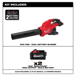 - (1) M18 FUEL Dual Battery Blower (2824-20), (1) tapered nozzle attachment, (1) flat nozzle attachment, and (1) M18 6 Ah High Output Battery 2-Pack (48-11-1862)