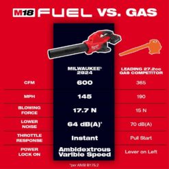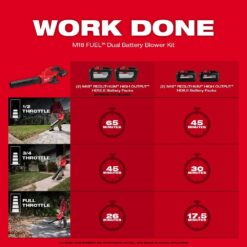 The MILWAUKEE® M18 FUEL™ Dual Battery Blower meets the performance, durability, and ergonomic needs of landscape maintenance professionals. This blower provides the Highest Constant Power by delivering a power output higher than all handheld gas blowers and maintaining that power level throughout the full charge of the battery. The POWERSTATE™ Brushless Motor delivers 600 CFM and 145 MPH, providing the ability to take on demanding applications like clearing wet leaves. The advanced electronic package allows the blower to reach Full Throttle in Under One Second, boosting control and productivity. The ambidextrous variable speed sliding lock on lever provides the ability to easily lock in the blower to the desired clearing power. This speed control mechanism, combined with the optimized balance, provides the Best Clearing Control in its class. MILWAUKEE® REDLINK PLUS™ Intelligence has total system communication between the tool and battery for unmatched levels of performance, protection, and productivity. This battery-powered blower includes both a tapered and a flat nozzle attachment, providing the ability to optimize airflow for different applications. The MILWAUKEE® M18™ REDLITHIUM™ HIGH OUTPUT™ XC8.0 Battery Pack provides 50% more power and runs 50% cooler vs M18™ REDLITHIUM™ XC battery packs. The optimized combination of smaller size and increased power of the 18-volt battery provides a great solution for the entire range of M18™ products.