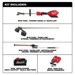 - Includes: M18 FUEL power head with QUICK-LOK (2825-20), M18 FUEL QUIK-LOK string trimmer attachment (49-16-2717), M18 REDLITHIUM HO8.0 battery (48-11-1880) and M18 and M12 rapid charger (48-59-1808)