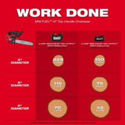 - Includes: M18 FUEL 14″ Top Handle Chainsaw, Scabbard, Scrench