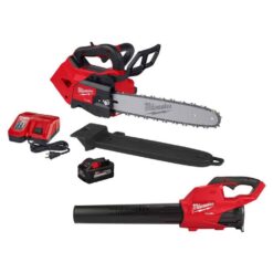 The Milwaukee M18 FUEL 14″ Top Handle Chainsaw Kit cuts faster than 35cc gas, delivers the power to cut hardwoods, and eliminates the headaches associated with gas engines. The saw is designed to meet the performance, durability, and ergonomic needs of the professional arborist, power utility linemen, and landscape maintenance professional. M18 FUEL technology allows the saw to reach full throttle in under 1 second providing ultimate control and cut faster than 35cc gas for increased application speed. The POWERSTATE Brushless Motor maintains speed under heavy loads without bogging down to outperform small gas engines and higher voltage systems. The saw eliminates all of the headaches associated with gas engines, such as pull starts, high noise levels, emissions, and regular maintenance. The REDLINK PLUS Intelligence enables full-circle communication between the tool and battery, providing you with unmatched levels of performance, protection, and productivity. The M18 REDLITHIUM HIGH OUTPUT XC 8.0 Battery provides efficient power delivery giving you longer runtime in application with the ability to make 150 cuts per charge in 4″ x4″ Cedar. The MILWAUKEE M18 FUEL Blower has the power to clear from 15 ft., gets to full throttle in under 1 second and is up to 4 lbs. lighter than competitors. Fully compatible with the M18 system, featuring over 250+ tools.
