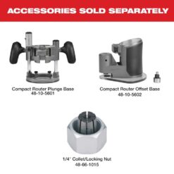 - 2723-20 Includes: one M18 FUEL compact router console, 1 fixed base, one 1/4 in. collet, 4 in. round sub-base plate, one 5-3/4 in. template sub-base plate, dust shroud, 1 straight edge guide, one 11/16 in. collet wrench, one 7/16 in. spindle wrench