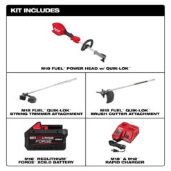 - Includes: M18 fuel power head with Quik-Lok (3016-20), string trimmer attachment (49-16-2717), reciprocator attachment (49-16-2794), M18 FORGE 8.0Ah battery (48-11-1881), M18/M12 rapid charger (48-59-1808)
