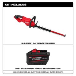 - Includes: (1) M18 FUEL 24 in. Hedge Trimmer (3033-20), (1) clippings sweep, (1) blade sheath, (1) M18 REDLITHIUM FORGE HD12.0 Battery (48-11-1813)
