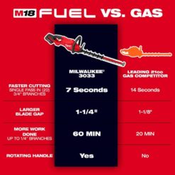 The MILWAUKEE M18 FUEL 24 in. Hedge Trimmer exceeds the power, performance, and durability needs of the landscape maintenance professional. The POWERSTATE Brushless Motor provides users the power to cut up to 1-1/4″ branches to complete aggressive cut-backs and allow for faster trimming. This hedge trimmer features a rotating handle, double-sided blades, and clippings sweep attachment, providing you with more control for clean cuts. REDLINK PLUS Intelligence offers total system communication between tool and battery for unmatched levels of performance, protection, and productivity. The MILWAUKEE M18 REDLITHIUM FORGE HD12.0 Battery Pack delivers 50% more power than the HIGH OUTPUT 12.0, high-speed cooling for less downtime in high-demand applications, 35-minute supercharge to 80%, and the longest life vs REDLITHIUM batteries. REDLITHIUM FORGE are Milwaukee’s most powerful, fastest charging, and longest-life batteries. The M18 REDLITHIUM FORGE HD12.0 delivers 12 amp hours of runtime with 50% more power than the HIGH OUTPUT 12.0, providing optimal power and runtime for demanding applications. The M18 FUEL 24 in. Cordless Hedge Trimmer is fully compatible with 275+ solutions on the M18 System.