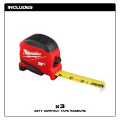 Milwaukee 48-22-1725-X3 Compact 25 ft. Tape Measure with Fractional Scale (3-Pack)