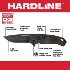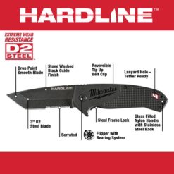 Milwaukee Hardline knives deliver uncompromising performance on or off the jobsite. This 3 in. Smooth Blade Pocket Knife and 3 in. Serrated Blade Knife both feature a D2 Steel blade that delivers extreme wear resistance. A flipper with bearing system allows fast, smooth opening. The Steel frame lock provides a strong, secure lock for tough applications. A reversible tip-up belt clip allows right or left-handed carry.