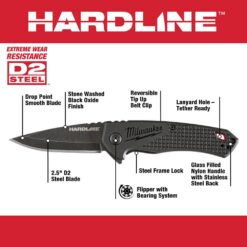Use the right knife for the job when you have the Milwaukee Hardline Pocket Knives. Their D2 steel blade has superior wear resistance and the steel frame lock keeps it secure even in tough applications. A flipper with bearing system provides smooth, easy opening. This knives feature a serrated tanto blade or a drop point smooth blade and includes a reversible tip-up belt clip so you can carry it either right- or left-handed.