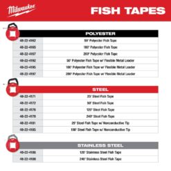 - Includes: 200 ft. polyester fish tape with flexible metal leader