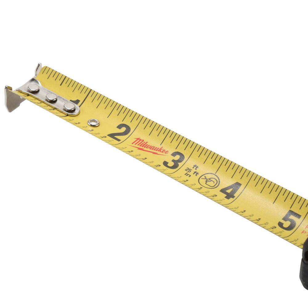 The Milwaukee 25 ft. Compact Tape Measures deliver up to 12 ft. of reach. These tapes are equipped with wear resistant nylon blade protection and an Impact-resistant 5-point reinforced frame to withstand the jobsite. An integrated Stamped steel belt clip enables users to easily carry the tape measure with them around the jobsite. The tape blade also features a Fractional scale. Includes four 25 ft. Compact Tape Measures.