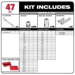 The Milwaukee 47-Piece SAE and Metric 1/2 in. Drive Ratchet and Socket Set offers better access in tight spaces and maximum tool strength. The 90-tooth ratchet tool offers 4of arc swing and a slim profile design, so users can work in tighter spaces. The Milwaukee socket set features an innovative wrench-compatible socket design with 4 flat sides to help prevent rolling. The 1/2 in. drive ratchet has sockets with sizes laser engraved into the flats for easy-to-read visibility. The optimized socket geometry additionally helps reduce bolt rounding and stripping. The Milwaukee ratchet and socket set includes a removable inner designed to be stored long-term in a steel storage chest and a durable carrying case for ultimate portability. The sets accessories guarantee users have what they need to tackle every job, both in the garage and on the jobsite. The 47-Piece SAE and Metric 1/2 in. Drive Ratchet and Socket Set is backed by a lifetime guarantee. This kit also includes one 1/2 in. drive extended reach ratchet for a total of 48-pieces.