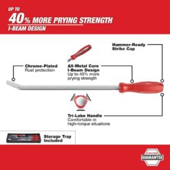 Upgrade your tool collection with this versatile and dependable Four-piece pry bar set, designed to tackle even the toughest tasks with ease. Featuring an I-Beam Design, it provides up to 40% more prying strength compared to traditional pry bars. Each pry bar is built with an All-Metal Core and a Hammer-Ready Strike Cap, enhancing leverage and ensuring long-lasting durability. The Comfort Tri-Lobe Handle offers a secure and ergonomic grip during use, while the Chrome Finish provides exceptional corrosion resistance for reliable performance over time. This 4-piece set is neatly organized in an Easy-Access Tray, offering a convenient and long-term storage solution for professionals and DIY enthusiasts alike.