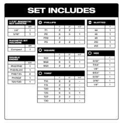 - 48-32-4082 includes: one 2.36 compact bit holder, two 1 in. PH2, six 1 in. PH2, two 1 in. PR2, two 1 in. PH3, two 1 in. SQ1, six 1 in. SQ2 , two 1 in. SQ3, two 1 in. T10. six 1 in. T15, six 1 in. T20, six 1 in. T25, two 1 in. T27, two 1 in. T30, one 1 in. SL #4, one 1 in. SL #6, one 1 in. SL#8, one 1 in. SL#10, one 1 in. SL #12, one 1 in. hex 3/32 in., one 1 in. hex 7/64 in., one 1 in, hex 1/8 in., one 1 in, hex 9/64 in.