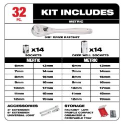 - 48-22-9482 Included: 32-piece 3/8 in. drive metric ratchet and socket set (48-22-9508). Sockets: 10 mm Deep, 10 mm, 11 mm Deep, 11 mm, 12 mm Deep, 12 mm, 13 mm Deep, 13 mm, 14 mm Deep 14 mm 15 mm Deep, 15 mm, 16 mm Deep, 16 mm, S17 mm Deep, 17 mm, 18 mm Deep, 18 mm, 19 mm Deep, 19 mm, 6 mm Deep well socket, 6 mm, 7 mm Deep, 7 mm, 8 mm Deep, 8 mm, 9 mm Deep, 9 mm, universal hose adapter, 3 in. extension, 6 in. extension, 90-Tooth 3/8 in. Drive Ratchet, PACKOUT compact organizer (48-22-8436)