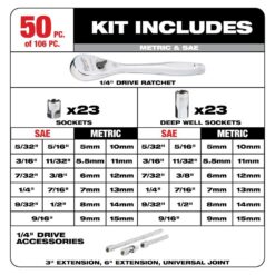 - Included: 56-piece 3/8 in. Drive Ratchet and Socket Set (48-22-9008), 50-piece 1/4 in. Drive Ratchet and Socket Set (48-22-9004), and PACKOUT Low-Profile Organizer (48-22-8431)