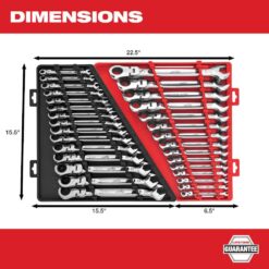 The MILWAUKEE 15 Piece Metric Flex Head Ratcheting Combination Wrench Set features 2.5 degrees of arc swing and 144 ratcheting positions, allowing quick and efficient work in tight spaces. The flex head wrenches have double-stacked pawls within the ratcheting mechanism, which increases durability and extends the life of the tools. The flexible head gives users increased accessibility in difficult-to-reach areas. The MAXBITE Open-End Grip improves the wrench’s grip on nuts and bolts, offering users 25% more torque than smooth-faced wrenches. This flex head wrench set feature ergonomic I-Beam handles designed for improved comfort and ink-filled size labels for easy size identification and quick distinction between SAE and metric sets. The 15-piece ratcheting combination wrench set comes in a tray designed for steel storage drawers for efficient storage with no wasted space. Milwaukee combination wrenches feature a lifetime guarantee.