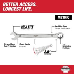 The Milwaukee Ratcheting Combination Wrenches feature 2.5° of arc swing, allowing quick and efficient work in tight spaces. These mechanic’s wrenches feature durable double-stacked pawls in the ratcheting mechanism, offering the longest ratchet life and improved access with 144 ratcheting positions. MAX BITE Open-End Grip improves the ratchet wrench’s grip on nuts and bolts, offering 25% more torque than smooth-faced wrenches. Each combination wrench features an ergonomic I-Beam handle design for improved comfort. The ratcheting combination wrench set features ink-filled size labels for easy size identification, as well as quick distinction between SAE and metric sets. The 15-piece metric ratcheting combination wrench set comes in a tray designed for steel storage drawers, allowing for efficient storage with no wasted space. These Milwaukee combination ratchet wrench sets feature a lifetime guarantee. Our Milwaukee 25 piece 1/4 in. Drive Ratchet and Socket Set is designed from the ground up, offering our users the Most Versatile Sockets that are Anti-Roll and Wrench-Ready. Its innovative FOUR FLAT Sides feature an anti-roll and wrench-ready design. The 90 tooth ratchet tool offers 4° of arc swing and a slim profile design, allowing you to work in tighter and more confined spaces, be it under the hood of a car or in the middle of a remodel.