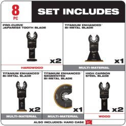 - 49-10-9212 includes: (2) 1-3/8 in. Titanium enhanced bi-metal multi-material blades, (1) 2-1/2 in. Titanium enhanced bi-metal multi-material blade, (1) 3-1/2 in. Titanium enhanced segmented bi-metal multi-material blade, (2) 1-3/8 in. Japanese tooth PRO-CURVE hardwood blades, (2) 1-3/8 in. HCS Wood blades, (1) storage case