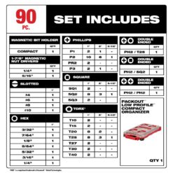 - Includes: (1)Compact Mag Bit Holder,(65) 1″ Insert Bits:(2) P1,(10) P2,(2) PR2,(2) P3,(2) SQ1,(8) SQ2,(2) SQ3,(2) T10,(2) T15,(8) T20,(8) T25,(2) T27,(2) T30,(2) T40,(1) SL#4,(1) SL#6,(1) SL#8,(1) SL#10,(1) Hex3/32″,(1) Hex7/64″,(1) Hex1/8″,(1) Hex9/64″,(1) Hex5/32″,(1) Hex3/16″,(1) Hex1/4″(16) 2″ Power Bits:(1) P1,(6) P2,(1) P3,(3) SQ2,(2) T20,(3) T25,(3) 3-1/2″ Power Bits:(1) P2,(1) SQ2,(1) T25,(3) Double Ended Bits:(1) P2/T25,(1) P2/SQ2,(1) P2/P2,(2) 1-7/8″ Mag Nut Drivers:(1) 1/4″,(1) 5/16″