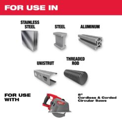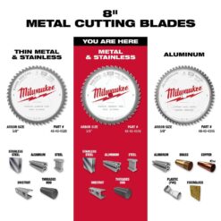 The Milwaukee 8 in. 42T Metal and Stainless Cutting Circular Saw Blades are specifically designed to exceed contractor’s expectations for blade life, cut quality and speed in the most demanding metal cutting applications – without a lubricant. The metal cutting circular saw blades feature hand-tensioned hardened alloy steel bodies. This extends the user’s blade life and delivers them the highest quality cuts available. The blades feature Cermet-Tipped Teeth with Alternate Top Bevel grind enabling users to shear through metal delivering you burr-free, cool-to-touch cuts.