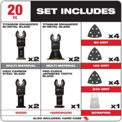 The Milwaukee Universal Fit Open-Lok 20-Piece Oscillating Multi-Tool Blade Kit offers users blades for multiple applications with a Modular Oscillating Blade Case. The Titanium Enhanced Bi-Metal Blades use premium high-speed steel and last up to 15X longer than standard high carbon steel blades. This Milwaukee oscillating multi-tool blade kit includes bi-metal blades ideal for smooth cuts in wood and nails, PVC, drywall, and a Japanese Tooth blade with Pro-Curve for fast, clean cuts and greater control in hardwood, clean wood, PVC, and drywall. The included oscillating multi-tool wood blades have aggressive, precision ground teeth for fast cuts in wood, drywall, and PVC. The stainless steel rigid scraper blade is great for removing adhesives and cutting with its sharpened edge. The 3-1/2″ Triangle Sandpaper comes in 60, 120, and 240 grit sizes. This kit also includes the Milwaukee Modular Oscillating Blade Case, allowing users to safely and easily customize their oscillating blade storage, and fits in Milwaukee Packout.