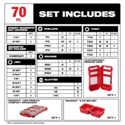 Milwaukee SHOCKWAVE Impact Duty Socket Set features the boldest, longest-lasting markings and extreme impact durability in high torque applications. The stamped and ink-filled size marking enables you to select the right socket every time throughout the life of the socket. Engineered with high-strength forged steel for optimized performance in heavy-duty applications. The non-slip hex geometry prevents fastener rounding. The Milwaukee dual-hole design and ring groove allow for easy socket attachment and removal. Sets can be kept organized in the included PACKOUT Low-Profile Organizer with a clear top for easy identification of parts at a glance. The Low-Profile Organizer is part of Milwaukee PACKOUT Modular Storage System, allowing for customization of storage systems to easily transport and organize tools and accessories. All Milwaukee SHOCKWAVE Impact Duty Sockets and Extensions are backed by Milwaukee’s Lifetime Guarantee and meet ASME industry standards. Milwaukee SHOCKWAVE Impact Duty 70 Piece Driver Bit Set with PACKOUT is engineered to be the Most Durable, Best Fitting driver bits on the market. The Milwaukee SHOCKWAVE Impact Duty driver bits are built to provide users with extreme durability for the most demanding applications. The set is organized in a customizable accessory case designed for use in PACKOUT. The Milwaukee PACKOUT Modular Storage System allows you to easily transport and organize your tools and accessories.